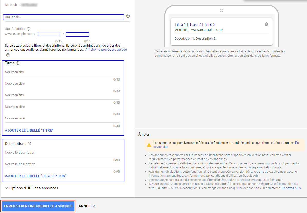 L’avantage de ce nouveau format d’annonce est que, contrairement aux annonces ETA (Expanded text ads) classiques où il est fortement recommandé d’intégrer un minimum de 3 annonces en rotation par adgroup pour en comparer les résultats, les Responsives Search Ads permettent d’intégrer au sein d’une seule et même annonce jusqu’à 15 Titres ( allant jusqu’à 30 caractères chacun ) et 4 Descriptions (jusqu’à 90 caractères chacun).