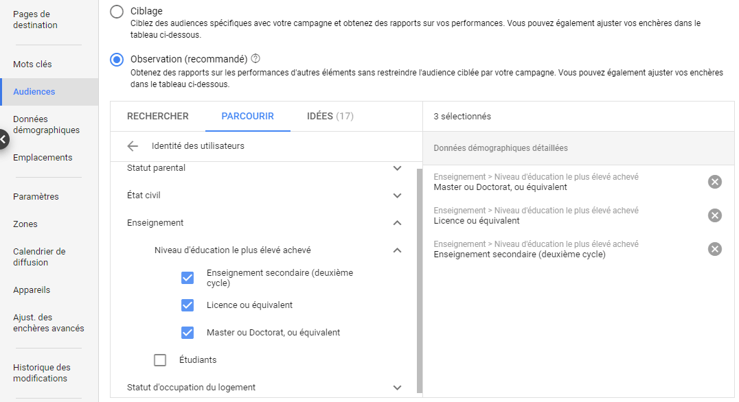 Pour les Niveaux d’enseignement ajoutez : « Enseignement secondaire », « Licence ou équivalent », « Master ou Doctorat » et « Étudiant ». Vous pourrez de la sorte favoriser le Niveau d’enseignement le plus performant en ajustant les enchères sur les catégories les moins intéressantes.